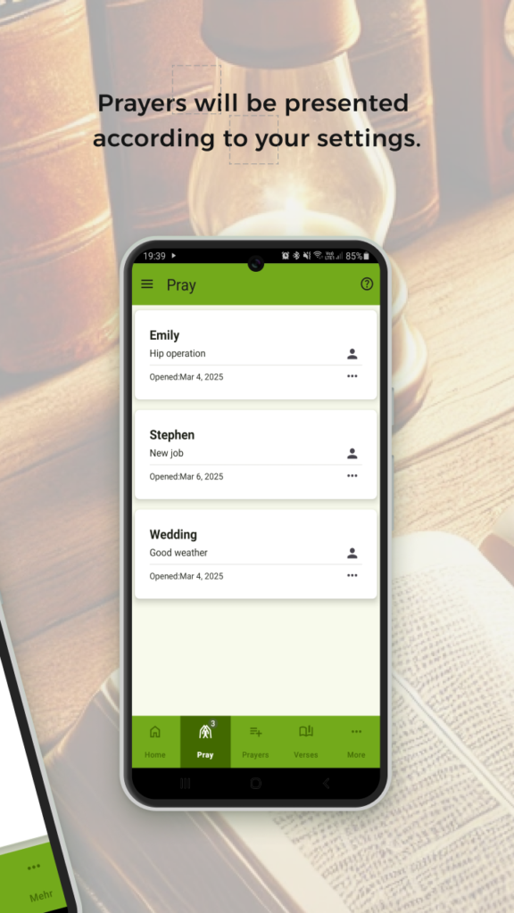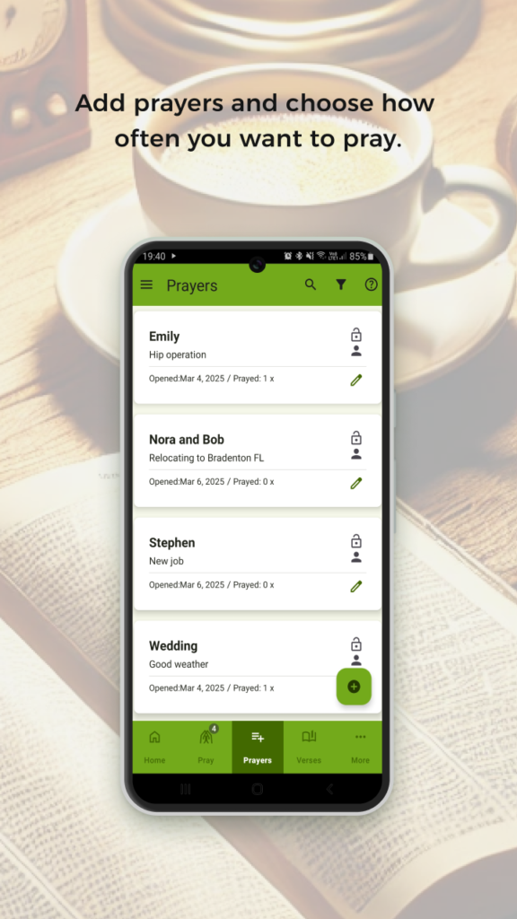 The prayers will be presented to you once they are due. If you have prayed for something, swipe to the left, and the prayer will be presented again according to your chosen periodicity.